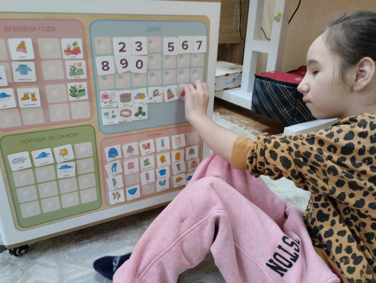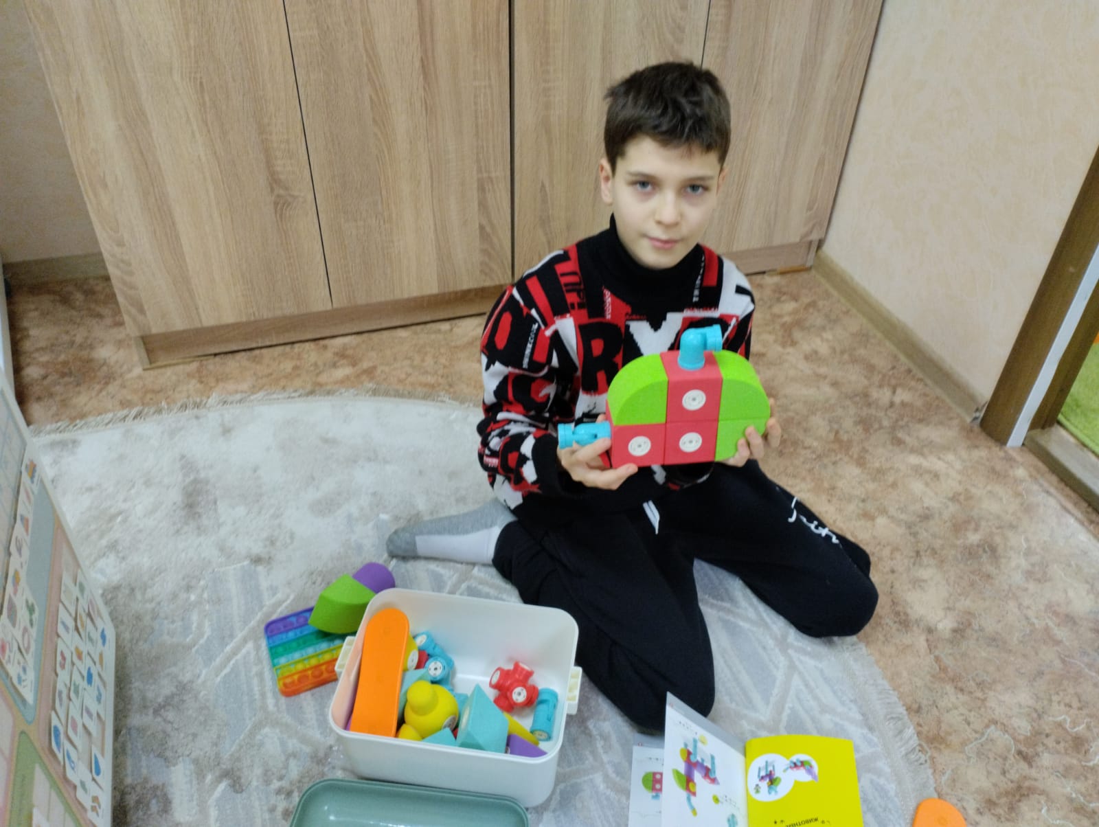В нем собрано лучшее оборудование для работы с детьми: визуальное расписание и календарь для наглядного отображения ежедневных дел ребенка, световой стол для рисования песком, набор тренажеров и полезного инвентаря – визуальные опоры, магнитный конструктор, массажные шары и другое.