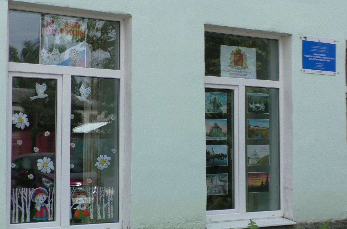 Воспитанники Камешковского СРЦН приняли участие в праздновании Дня России. Ребята посчитали нужным напомнить, что в складывании российской государственности особую роль сыграло Владимирское княжество. Поэтому одно окно стало витриной достопримечательностей Владимирской земли. А второе - украсили красавицы в русских сарафанах среди берёз и ромашек.