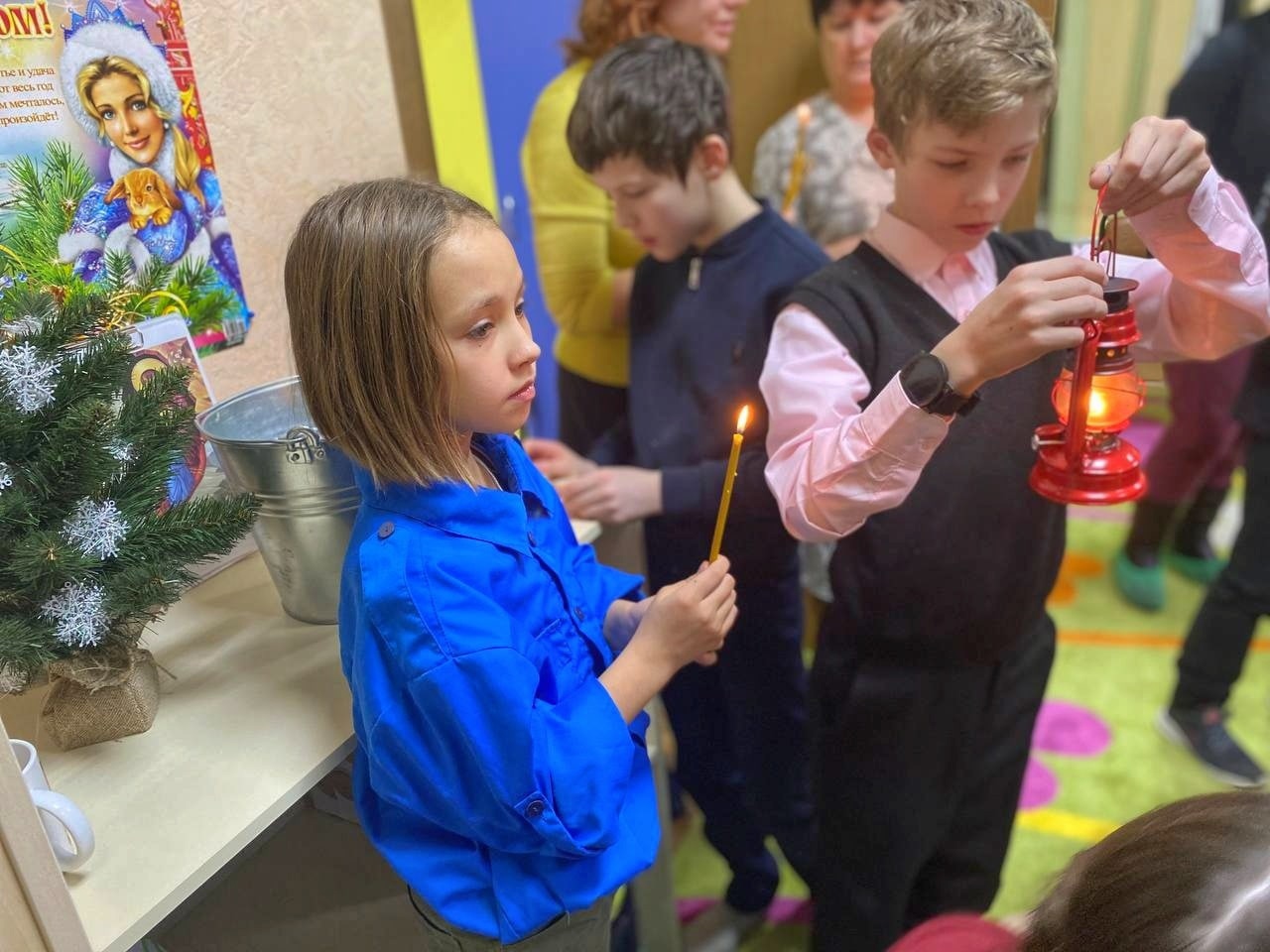 В течение двух часов дети и родители с удовольствием принимали участие в программе мероприятия: отгадывали загадки, выполняли творческие задания, рисовали, играли и дарили подарки. Закончилось все совместным чаепитием, после которого желающие смогли зажечь свои лампадки и унести Вифлеемский огонь домой. Принесенная в их дом частица огня в канун Рождества Христова будет нести свет добра и покоя, надежды и любви, мира и дружбы.