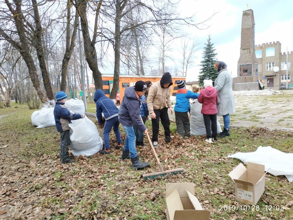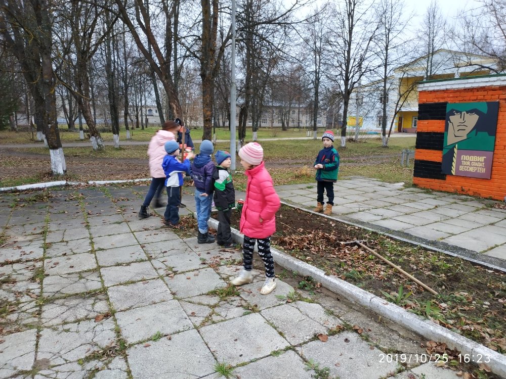 Так и сегодня, в первый день школьных каникул, воспитанники вместе с воспитателем организовали уборку памятника: собрали мусор, сгребли опавшие листья, подрыхлили почву в цветниках, протерли плиты памятника от грязи.