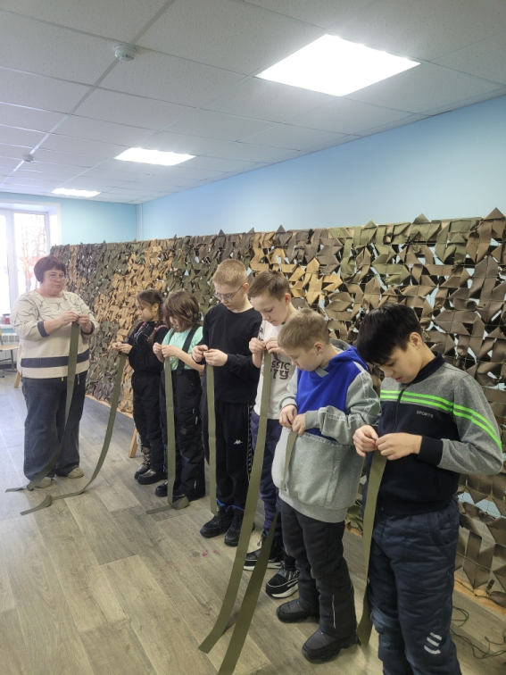 Также ребята приняли участие в плетении маскировочных сетей для фронта.