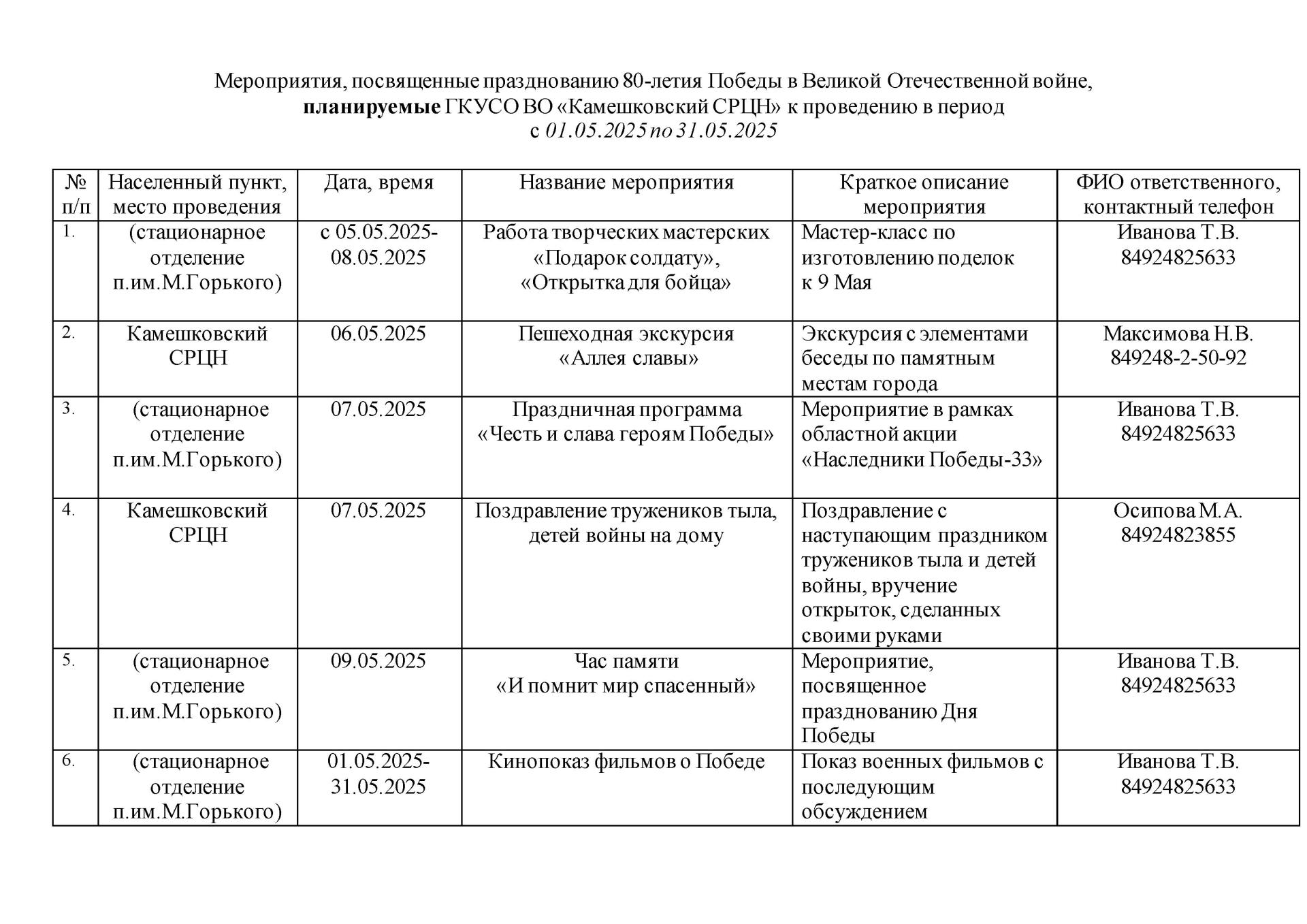Мероприятия, посвященные празднованию 80-летия Победы в Великой Отечественной войне, планируемые ГКУСО ВО «Камешковский СРЦН» к проведению в период с 01.05.2025 по 31.05.2025