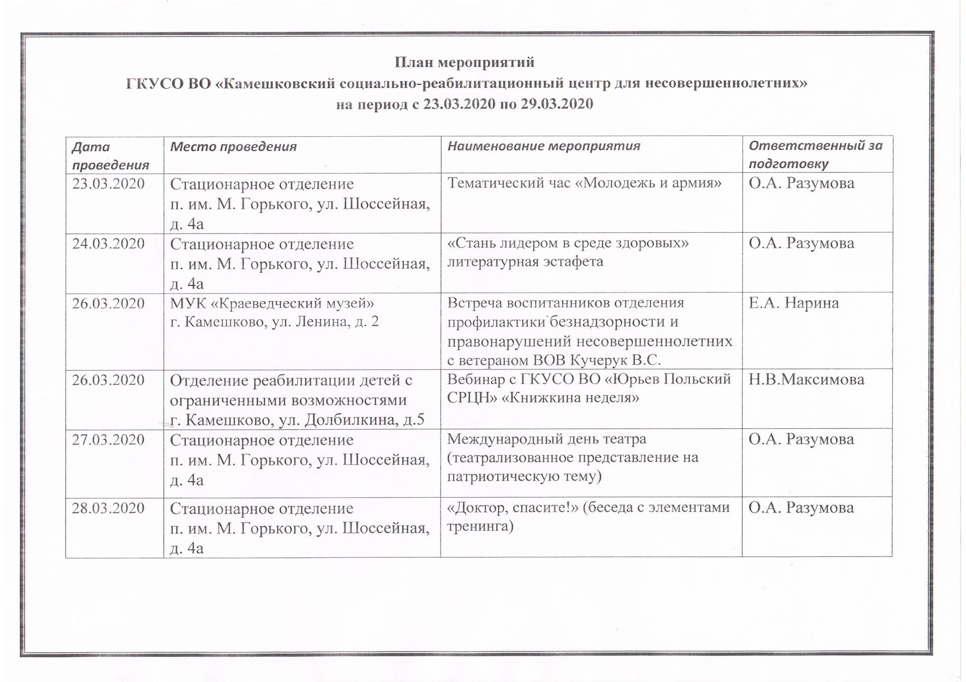 План мероприятий с 23.03.2020 - 29.03.2020